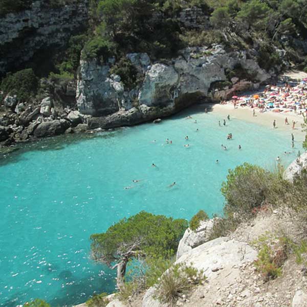 Auf der Baleareninsel zeigt der Kalkstein seine dekorativste Seite. Das Wasser ist smaragdfarben, der Sand pudrig und fein. Die Cala Macarelleta ist nur zu Fuß über die Klippen erreichbar. Wer oben ist, muss schließlich eine steile Treppe aus Holz hinab bis zum Strand. Wie ein Kragen legen sich die Felsen rund um die Bucht von feinstem Sand. Wem das zu steil und unwegsam erscheint, kann mit dem Auto zur Cala Mitjana fahren. Diese Bucht ist fast ebenso schön, dafür aber wesentlich besser erreichbar und oft überlaufen.